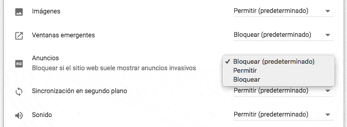 - Localizamos Anuncios y pulsamos en le botón que aparece en la parte derecha, el que pone Bloquear (predeterminado). Seleccionamos Permitir. (Si en cualquier momento queremos volverlo a su estado primitivo, solo hay que seguir los mismos pasos y activar Bloquear).